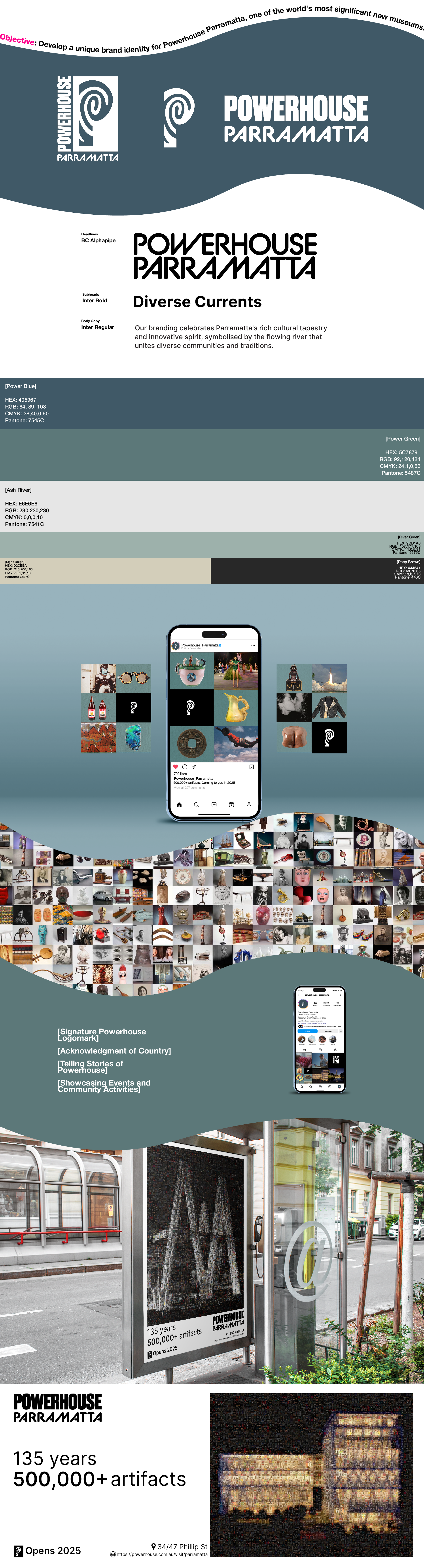 Branding project for Powerhouse Parramatta museum. Located in one of Australia's fastest-growing and most diverse communities, the task is to create a distinctive brand identity along with key visual assets for a launch campaign.